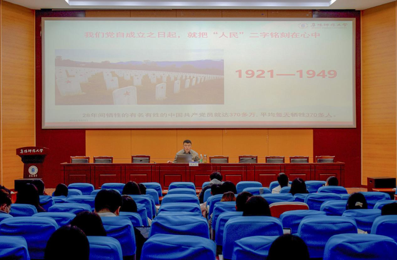为深入学习贯彻党的十九届六中全会精神,12月11日下午,校团委特别邀请我校全国高校思想政治理论课教学骨干、校级青年讲师团成员赵永明在躬行楼报告厅与我校一百余名学生骨干和全校39家学生社团负责人面对面交流什么是“人民至上”。