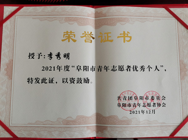 据介绍,李秀明同学自2019年12月注册成为一名青年志愿者以来,积极响应学校和地方政府号召,用实际行动践行奉献、友爱、互助、进步的志愿精神,积极参与疫情防控、社区治理、助老助残、生态环保、大型赛会、文明城市创建、关爱困境青少年等各类志愿活动并表现突出。