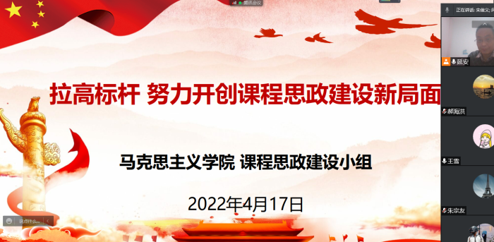 为深入贯彻落实习近平总书记在学校思想政治理论课教师座谈会上的重要讲话精神,根据教育部《高等学校课程思政建设指导纲要》文件精神和《阜阳师范大学课程思政建设实施方案(修订)》部署要求,4月17日,马克思主义学院通过“腾讯会议”网络平台召开课程思政建设推进会,学院党委书记高思杰,党委副书记、院长闫成俭,副院长朱宗友,思政课教研部主任李全文以及17位课程思政指导教师参加会议。会议由马克思主义学院课程思政负责人杨军主持。