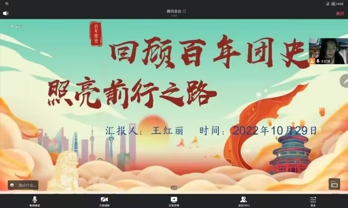 “青春如初春,如朝日,如百卉之萌动,如利刃之新发于硎,人生最宝贵之时期也。青年之于社会,犹新鲜活泼细胞之在身”,主题团课以“回顾百年团史,照亮前行之路”为主题,由团务组成员王红丽主讲,2021级和2022级全体团员参加。王红丽通过视听结合的方式从共青团的三个发展阶段,带领大家回顾共青团的百年历史,并绘声绘色地向大家介绍优秀团员的光荣事迹。从中大家了解到,百年来代代青年始终追随着党旗的方向奋勇拼搏,建设伟大事业,书写中国青年运动的历史华章。