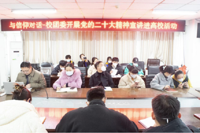 为深入学习宣传贯彻党的二十大精神,更好团结引领广大团员青年永远跟党走、奋进新征程,夺取新胜利,12月9日下午,校团委举办“与信仰对话”专题报告会,省青年讲师团宣讲员胡晓岚应邀在线作专题宣讲。校团委全体成员和各二级学院团委负责人在西湖校区正行楼1004会议室集中参会,我校第21期“青马工程”培训班学员以及学生代表200余人分散在线上参会。宣讲会由校团委副书记杨劲主持。