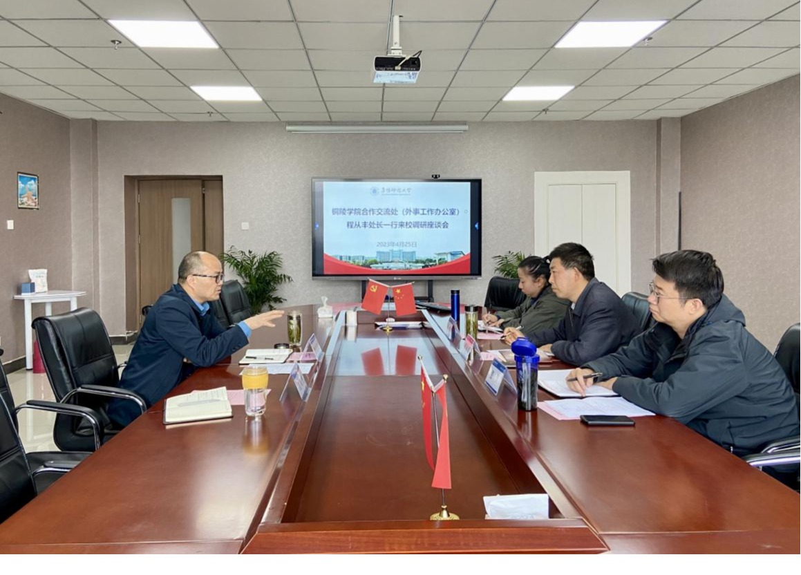 程从丰介绍了铜陵学院的外事工作基本概况,并就中外合作办学项目进行了重点咨询和探讨。他表示,将借鉴我校在中外合作办学项目的前期申报工作以及后续意识形态管控、管理制度建设、教学质量保障、师资队伍建设等方面的成功经验及发展成效,推动解决目前项目申报过程中存在的难题。