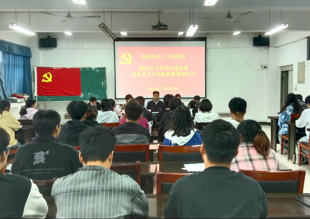 为深入学习贯彻党的二十大精神,学习贯彻习近平总书记关于党的建设的重要思想,扎实做好党员教育工作,强化党员队伍建设,9月24日,物理与电子工程学院党委在躬行C楼505教室举行了新党员入党宣誓仪式。学院党委书记吴学军参加仪式并讲话,党委组织员、各学生党支部书记及今年6月发展的38名新党员参加了仪式,仪式由自动化系学生党支部书记李聪主持。