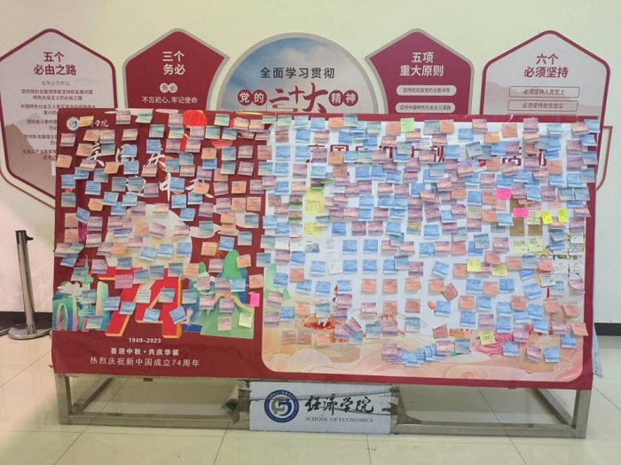 “迎中秋,庆国庆”主题寄语活动。为展示学生的爱国热情,表达学生为祖国祝福的爱国情怀,经济学院于9月27日至28日在清河校区开展“迎中秋,庆国庆”主题寄语活动。一句句真切的话语、一笔笔工整的字迹,展现了青年学子们对祖国深深的爱意和诚挚的祝福,祈愿祖国繁荣昌盛、国泰民安。