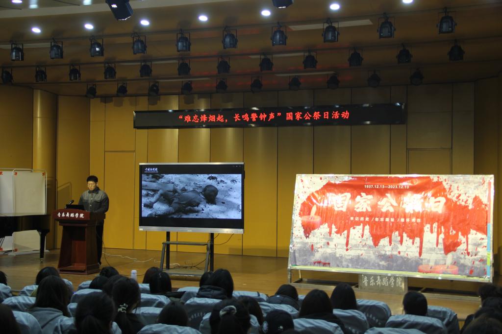 12月13日是第十个南京大屠杀死难者国家公祭日,为缅怀在南京大屠杀中30万遇难同胞,重温这段民族痛史,缅怀同胞先烈,祈愿和平永驻,音乐舞蹈学院在韶华楼报告厅组织开展了以“难忘烽烟起,长鸣警钟声”为主题的悼念活动。