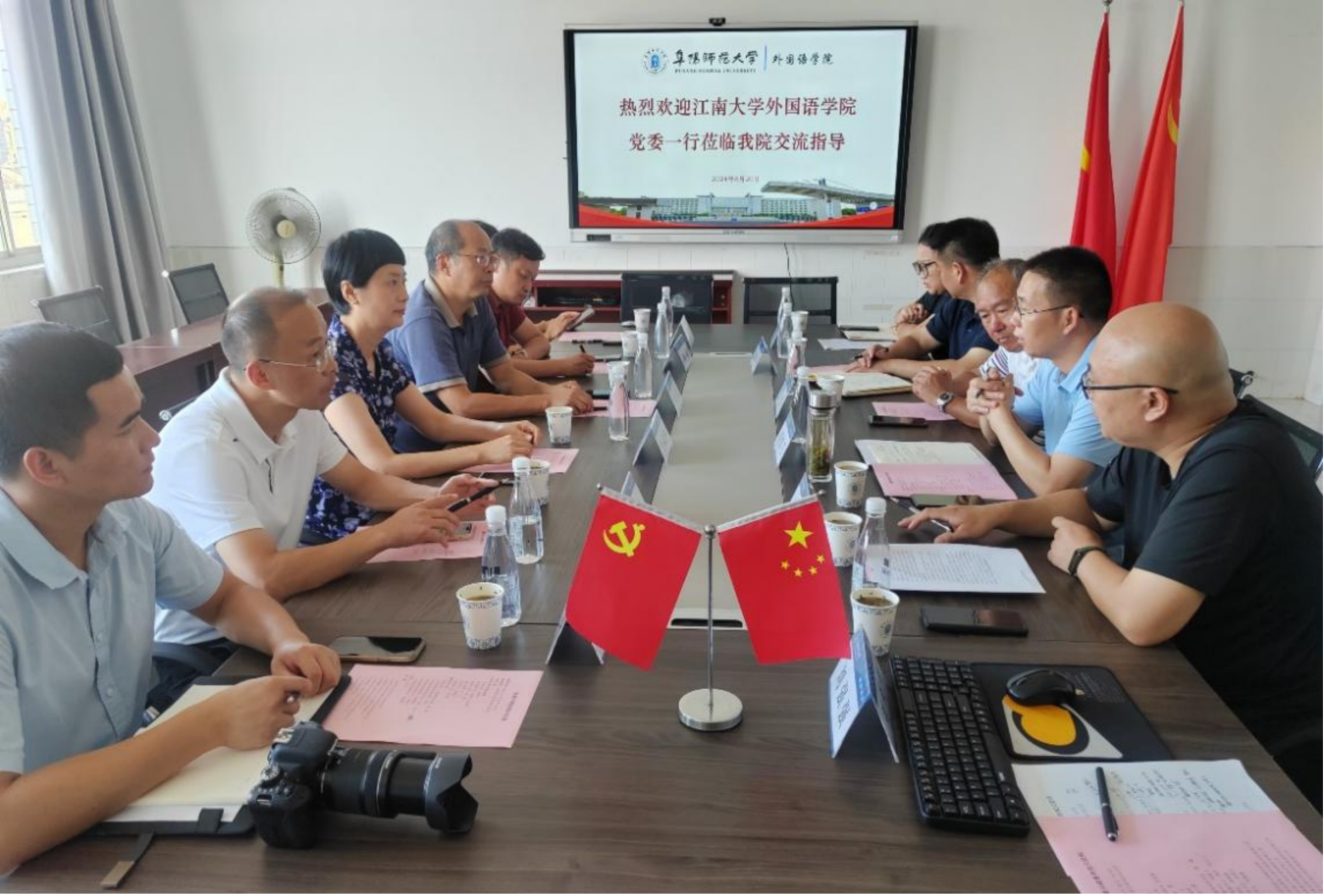 为深入学习贯彻习近平新时代中国特色社会主义思想和党的二十大精神、党的二十届三中全会精神,进一步深化长三角一体化发展,8月20日,外国语学院与到访的江南大学外国语学院举行会谈,签署党建共建协议。江南大学外国语学院党委书记李荣华,党委副书记、副院长刘伯贤;阜阳师范大学党委委员、发展规划处处长程建,外国语学院党委书记刘张飞,党委副书记、院长赵从义,副院长高福猛参加活动。仪式由赵从义主持。