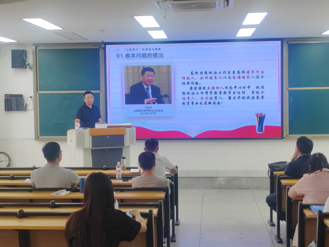 黄正杰以“春风化雨,以爱育人”为主题,以高校思想政治工作要培养什么样的人、如何培养人以及为谁培养人这个根本问题导入,从“三全育人及五育并举的理念沿革与框架、当代大学生的主要特质、教师背负的育人责任、新时代的担当作为”等方面,生动诠释了“三全育人”视角下学校育人队伍在大学生五育并举中的时代担当。同时,黄正杰通过生动的案例分析,深刻剖析了当代大学生的思想特点,号召学院教师坚持正确政治方向,以身作则,言行雅正,做好榜样,引领帮助学生“扣好人生的第一粒扣子”,同时要以具有崇高师德为奋斗目标,做“四有”好老师。