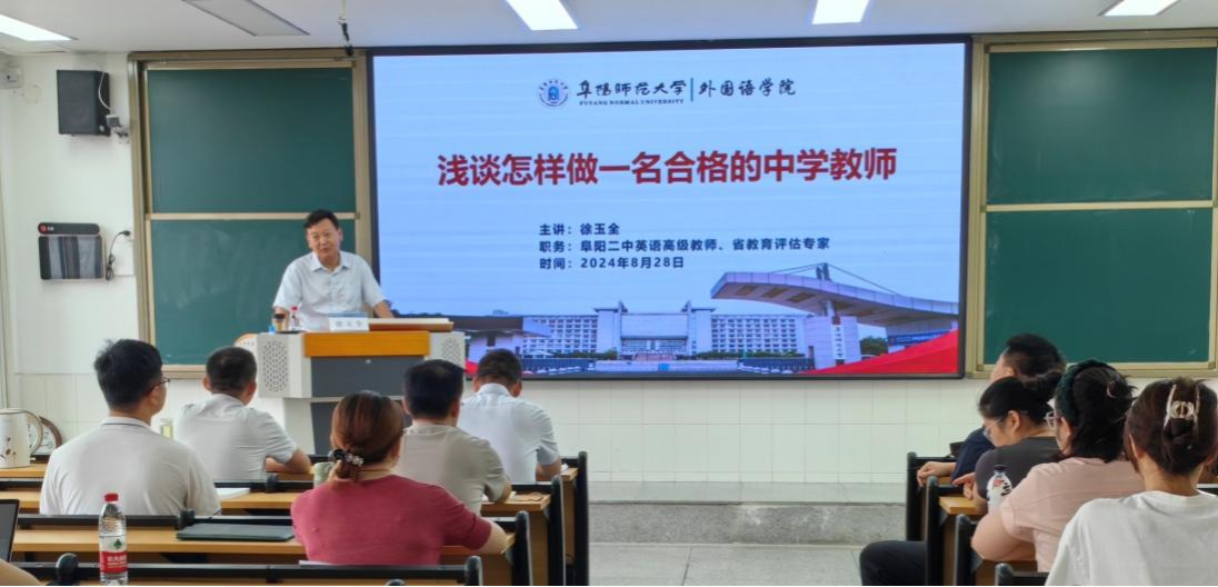 28日上午,阜阳市第二中学高级教师、省级教育评估专家,外国语学院1995届校友徐玉全作了一场主题为“浅谈怎样做一名合格的中学教师”的专题讲座。徐玉全从做有思想的教师、有较高的科学素养、有自己的工作规划、有丰富的教学知识、把重点放在课堂上、要理性借鉴与学习和对教师的更高要求七个方面阐述了如何成为一名合格的中学教师。他认为一名合格的中学教师要用自己的专业知识去引领学生,用人格的魅力征服学生,用真情去换取学生的真情。