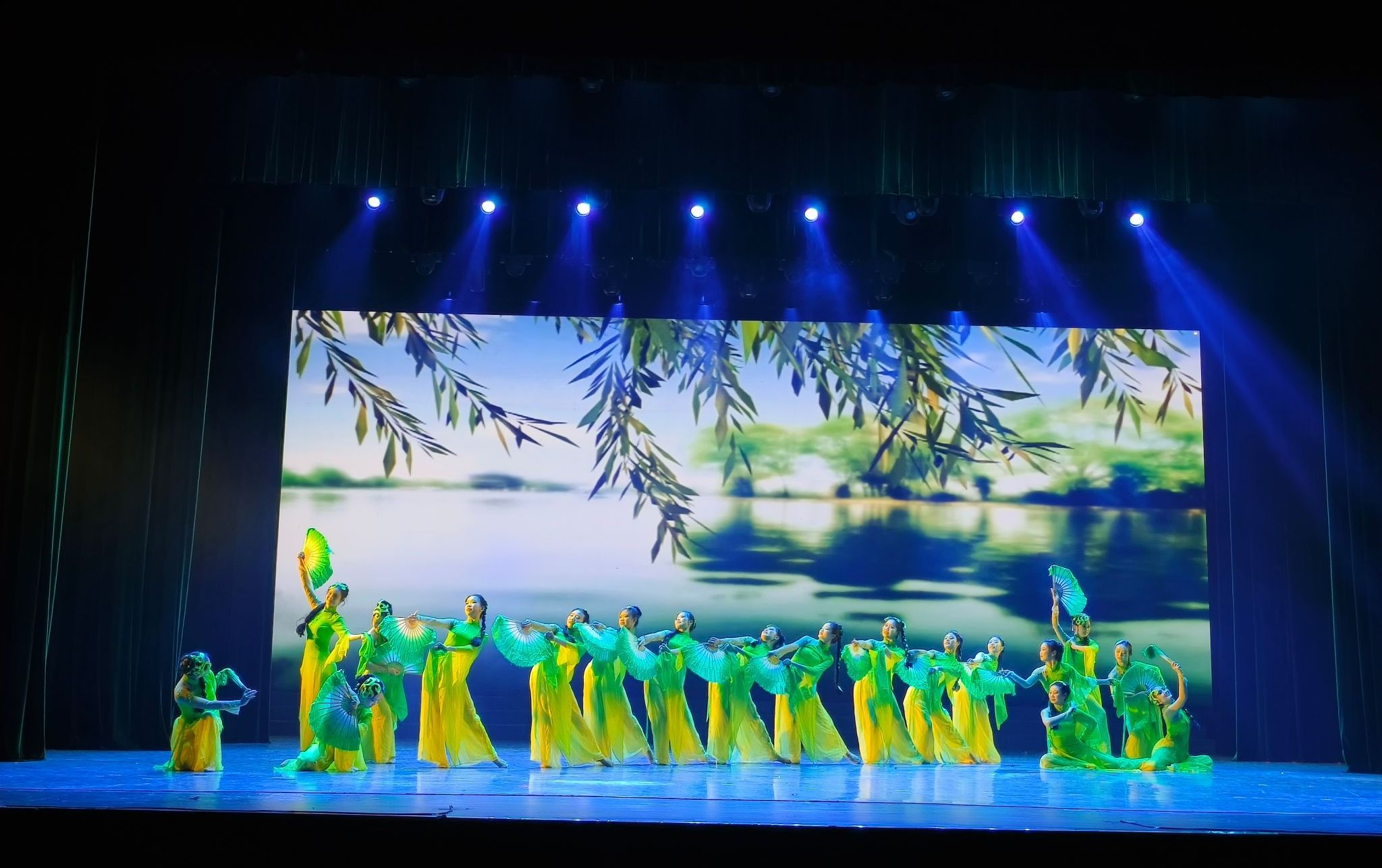 《淮畔杨柳腰》是由音乐舞蹈学院戎龚停教授作曲,宁小双、任杰、沈庆轮三位老师编导排练的原创舞蹈剧目。群舞《淮畔杨柳腰》以安徽花鼓灯中风摆柳舞姿为基础,运用拟人化的手法把杨柳比作姑娘柔软的腰肢,手中的绸扇忽左忽右,仿佛让人看到一排柳树在风中摇曳生姿。整个作品舞蹈语汇俏丽多姿、音乐风格清新活泼。既塑造淮畔佳人轻盈袅娜、舒展柔美之舞姿,表现飞袂拂云雨、翩如兰苕翠等舞境,也彰显了新时代淮畔山水孕育之大美、杨柳秀色照人之生机。