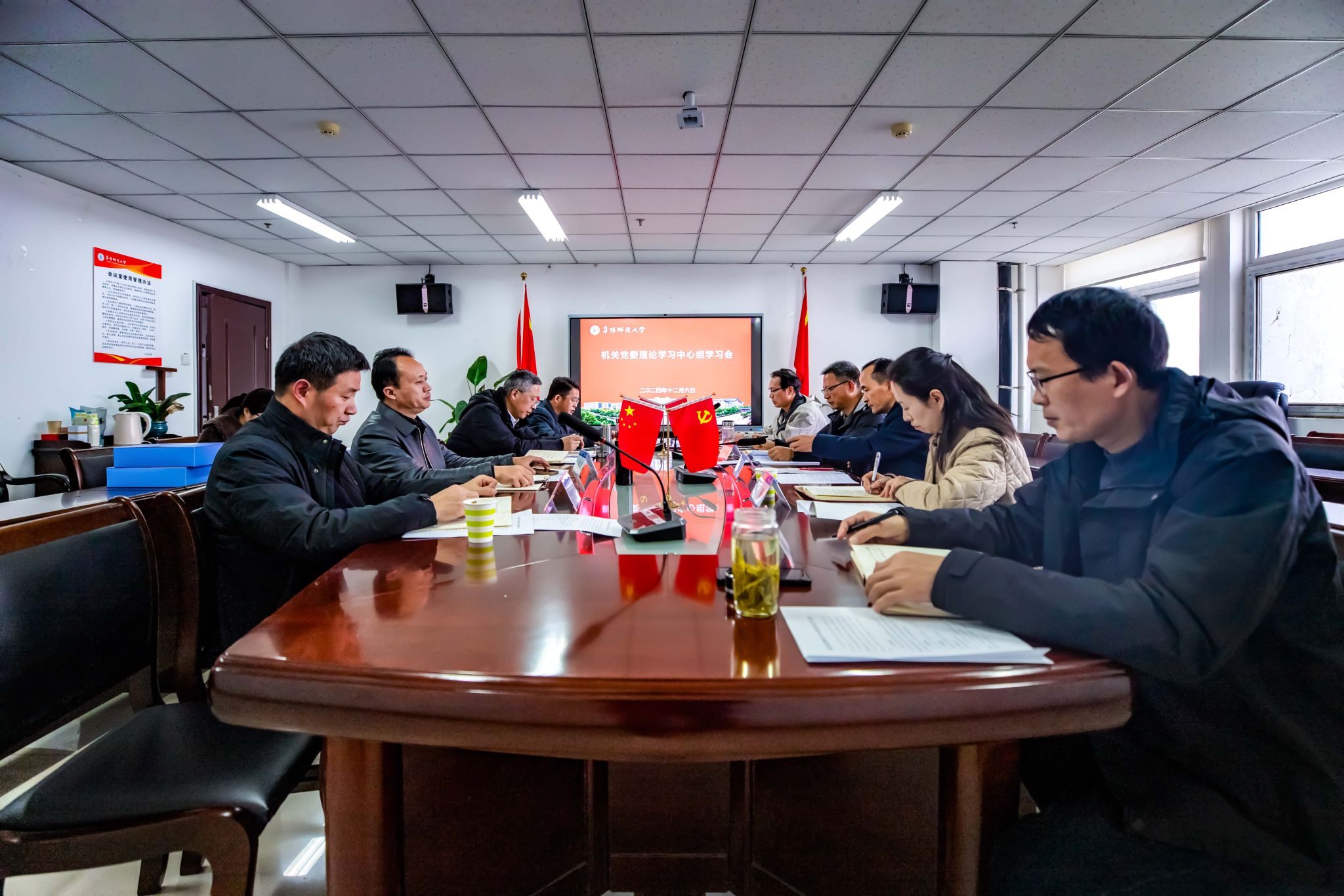 12月6日下午,机关党委召开理论学习中心组学习会,深入学习领会习近平总书记关于党的建设的重要思想和考察安徽重要讲话精神。校党委列席旁听工作组第三组副组长、党委宣传部(统战部)常务副部长、文学院党委书记王清到会指导。机关党委委员参会,会议由机关党委书记辛卫民主持。