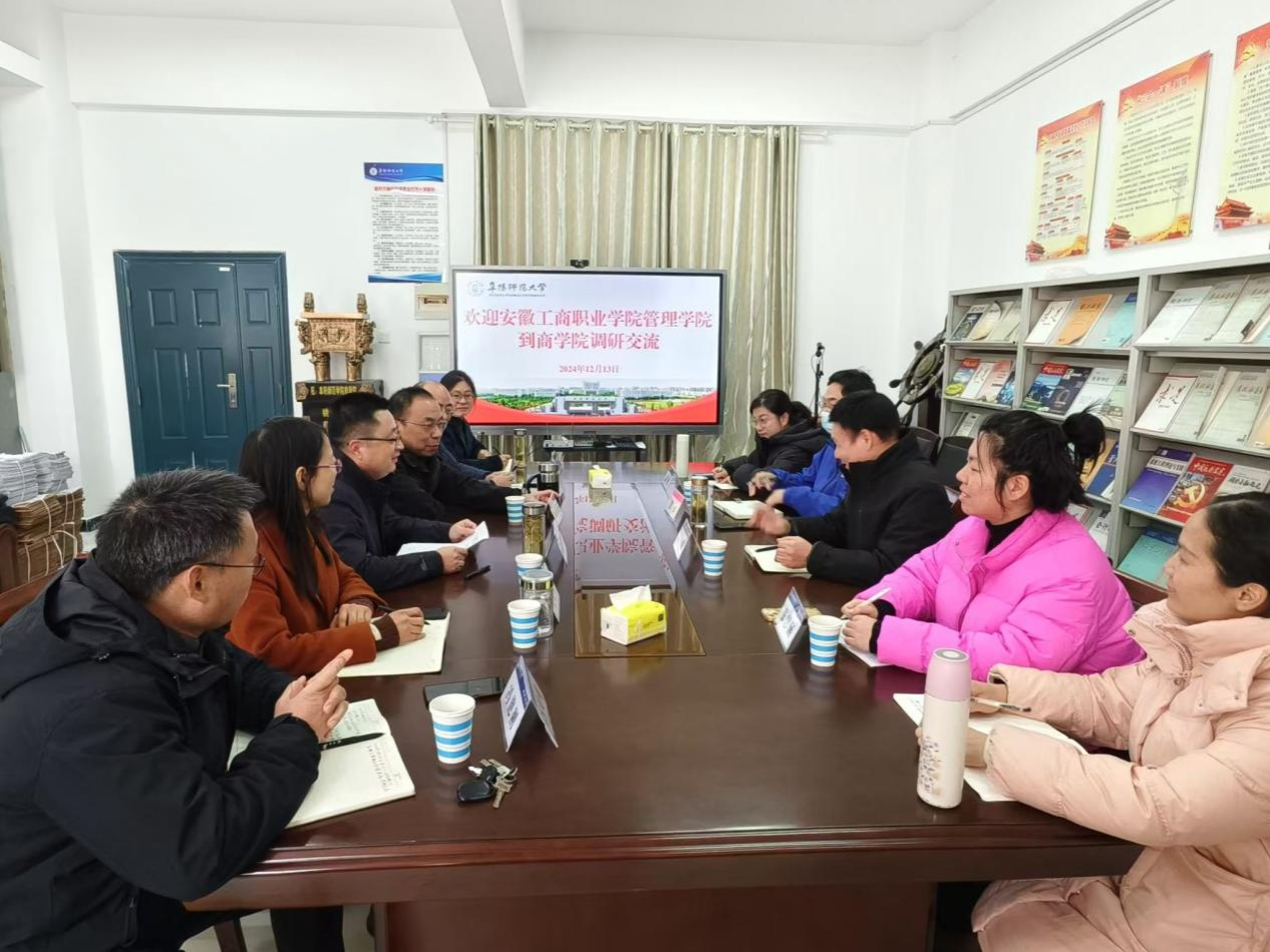 商学院院长朱剑峰简要介绍了学院的整体情况,着重对当前的学科专业设置、教学科研成果、师资队伍建设等方面进行了详细说明。曹大友对商学院的接待表示感谢,并介绍了安徽工商职业学院管理学院的基本情况。他指出,专升本联合培养模式是本科高校与高职院校优质教育资源共享互补的重要方式,希望在学科竞赛、专业实习、就业创业、毕业论文等方面加强交流与合作,不断拓展协同育人、联合培养工作新路径,共同探索高质量人才培养成效新模式。