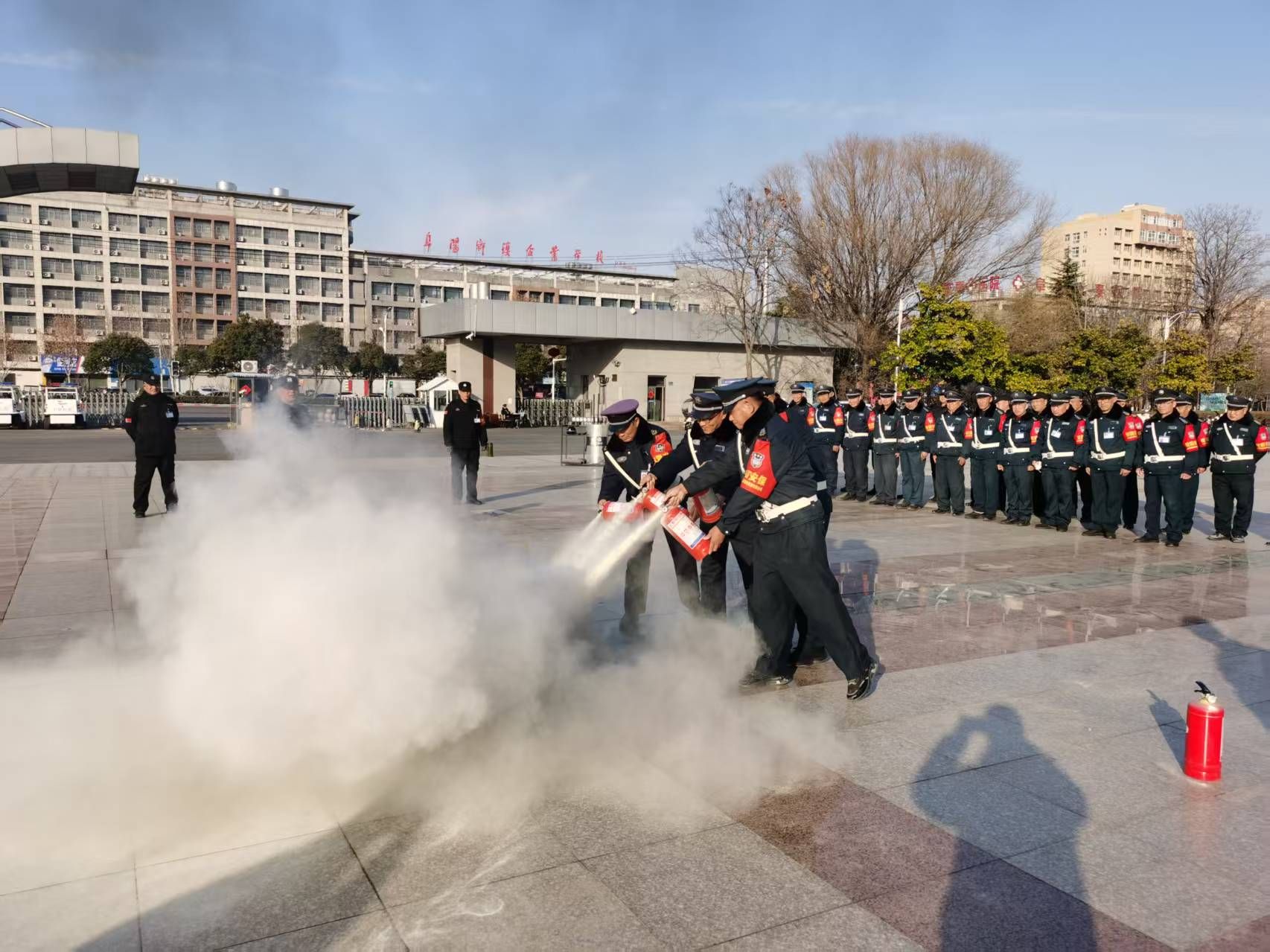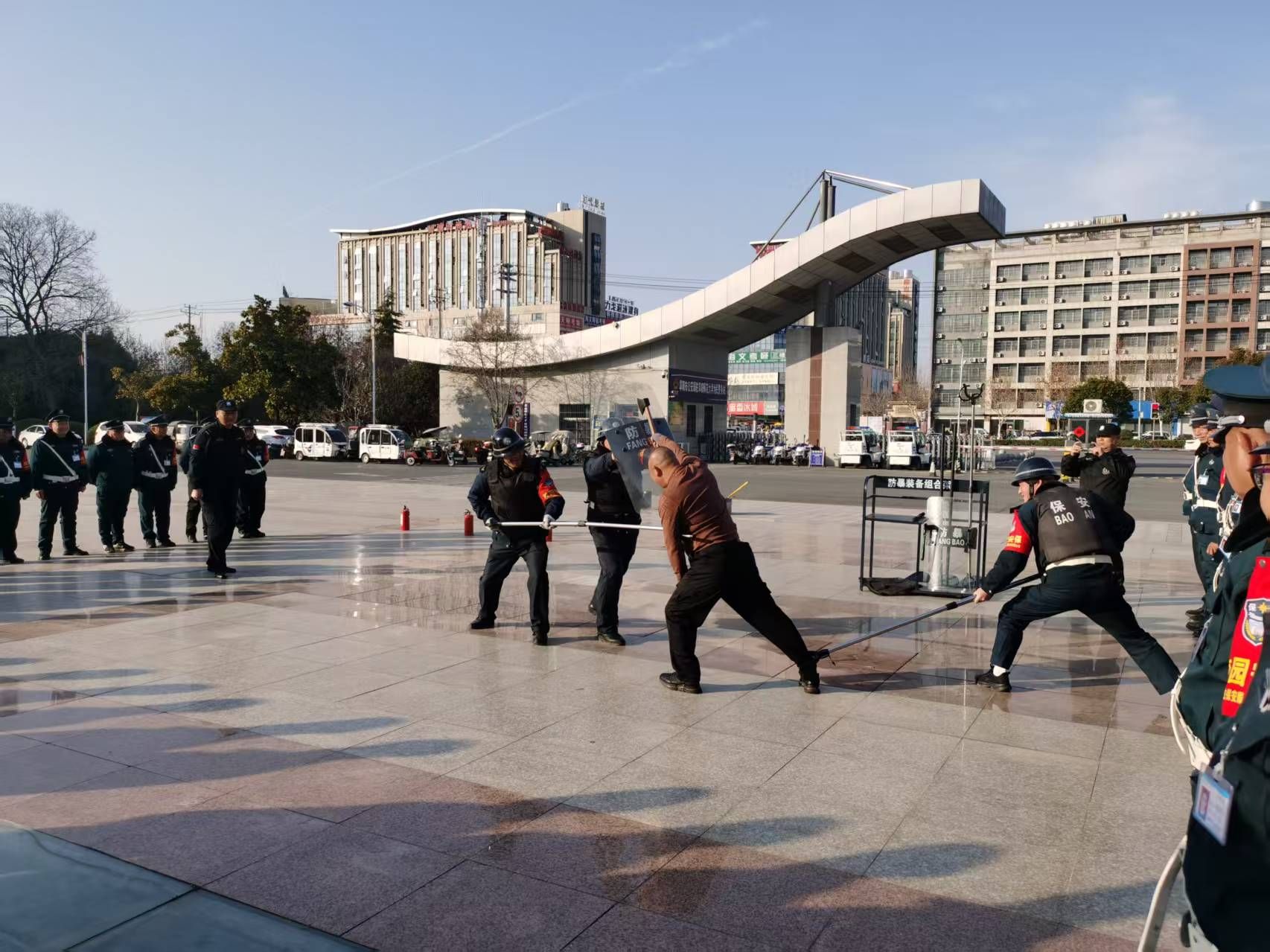 培训会第二环节为实操演练。驻校全体安保人员观看了最小应急作战单元演练视频公开课,学习了解防暴处突的基本流程和技巧。随后在西湖校区北门广场全体安保人员开展实操演练,培训教官详细讲解安防器械和消防器材的使用方法,组织保安员现场操作演练,熟悉掌握灭火器、防暴盾牌等器械的使用技巧,进一步提升驻校安保人员应对校园火情、暴力事件等突发情况的实战能力。