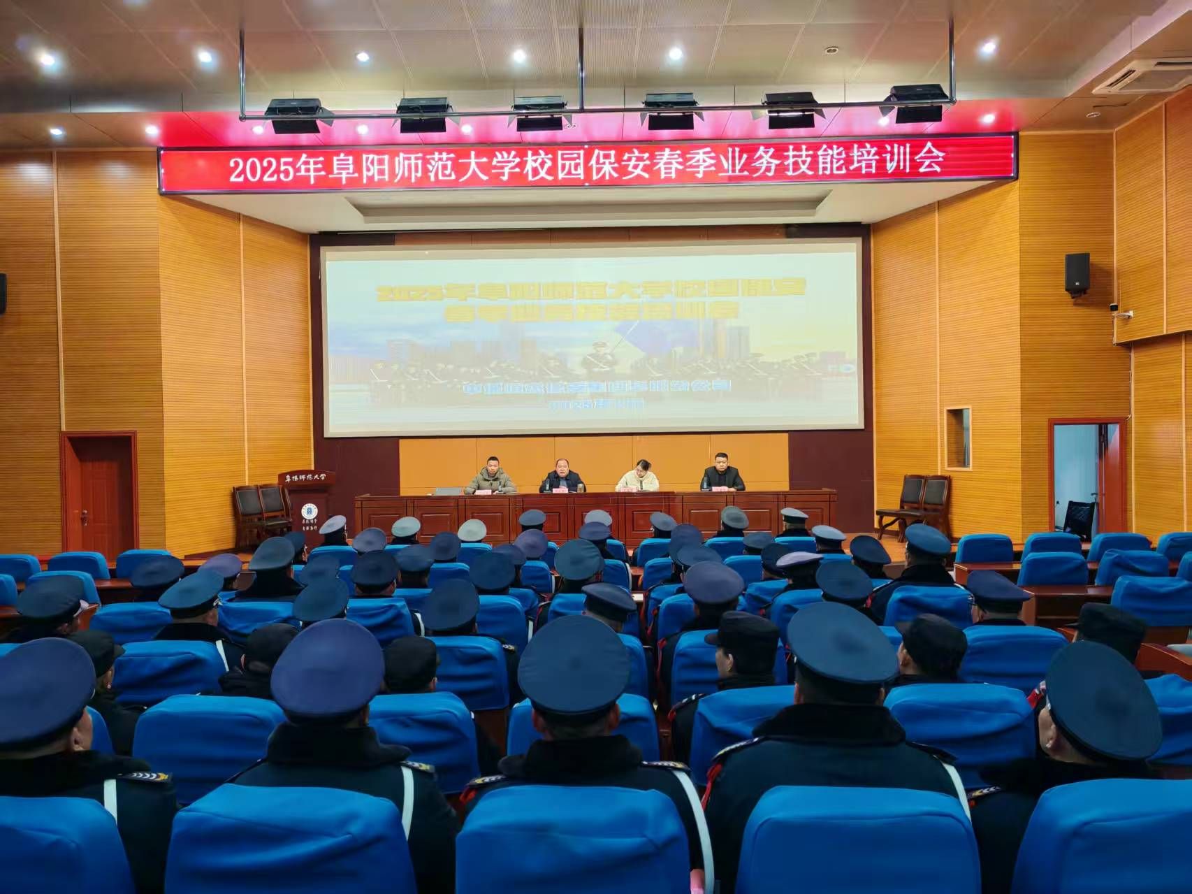 为进一步加强校园安全管理,切实做好新学期学校安全保障准备工作,提升驻校保安队伍人员的政治素质和业务技能,2月10日下午,学校安全管理处(党委保卫部)在西湖校区F楼报告厅举办“2025年校园保安春季业务技能培训会”。培训会由安全管理处与中保恒杰保安服务集团有限公司阜阳分公司联合举办,安保公司全体驻校保安人员全程参与,安全管理处(党委保卫部)负责人和其相关科室人员参加培训会。