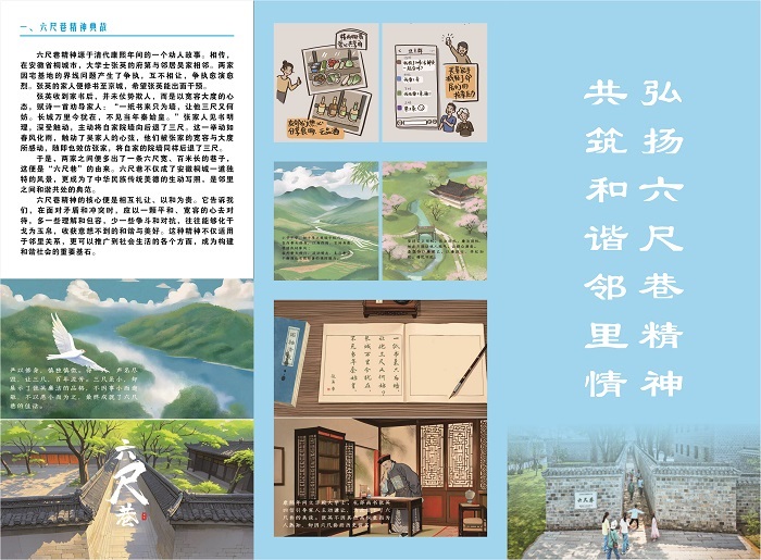 发放手册,传递文化精髓。为增强宣讲实效,学生们精心设计并印制了《弘扬六尺巷精神,共筑和谐邻里情》手册。手册以图文并茂的形式讲述清代桐城“六尺巷”典故的历史背景、文化价值及现实意义,并融入新时代邻里相处、社区治理的实践案例。返乡团干部们走街串巷,向居民发放手册,并结合具体案例,生动讲述了“六尺巷”精神在化解矛盾纠纷、促进邻里和睦相处中的重要作用。同学们还引导村民在日常交往中学会换位思考、相互理解,倡导以和为贵、礼让为先的美德,推动形成文明、和谐、向上的社会风尚。