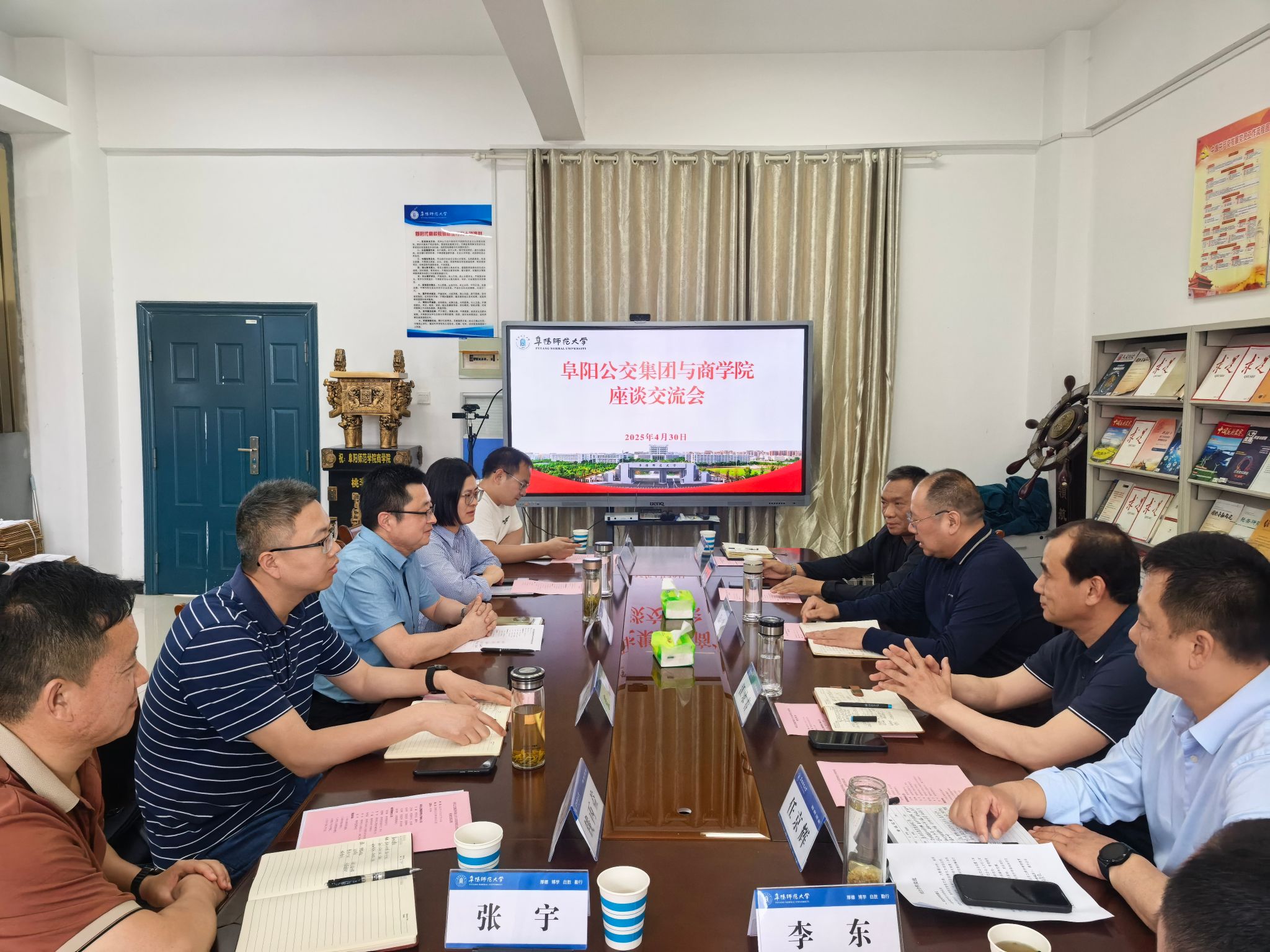 4月30日,阜阳公交集团有限公司党委书记、董事长任鑫,党委副书记、总经理江录春等一行到访商学院,就院企合作、人才培养、产学研融合等议题开展交流座谈。商学院党委书记宋东锋、院长张雪梅及相关专业教师代表参加,座谈会由宋东锋主持。