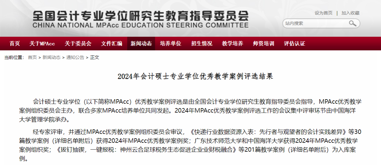 会计硕士专业学位(以下简称MPAcc)优秀教学案例评选是由全国会计专业学位研究生教育指导委员会指导,联合多家MPAcc培养单位共同发起。MPAcc教学案例入库评选,是教育部学位与研究生教育发展中心和全国会计专业学位研究生教育指导委员会为进一步满足会计专业学位案例教学需求,提高案例教学质量,开展的征集和评选活动。2024年MPAcc优秀教学案例评选工作的会议集中评审环节由中国海洋大学管理学院承办。