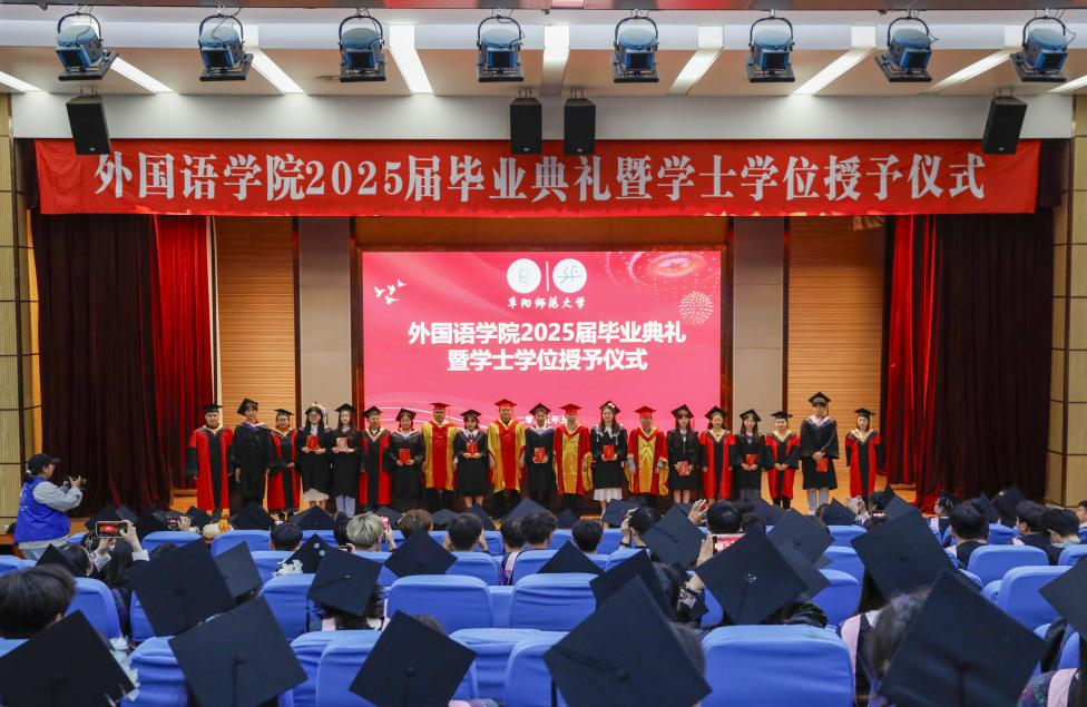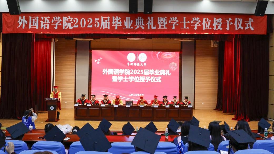 5月24日,外国语学院2025届毕业典礼暨学士学位授予仪式在正行楼二楼报告厅隆重举行。学院党政领导、系部主任、毕业班辅导员、教师代表、学生家长及2025届毕业生齐聚一堂,共同见证这一庄严而温情的时刻。典礼由党委书记刘张飞主持。