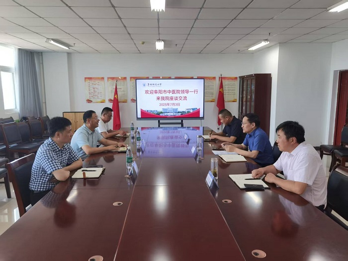 7月3日上午,阜阳市中医医院党委书记王继年、院长刘磊一行来阜阳医学院座谈交流,阜阳医学院党总支书记石有武、院长刘玉祥参加座谈会。座谈会由刘玉祥主持。