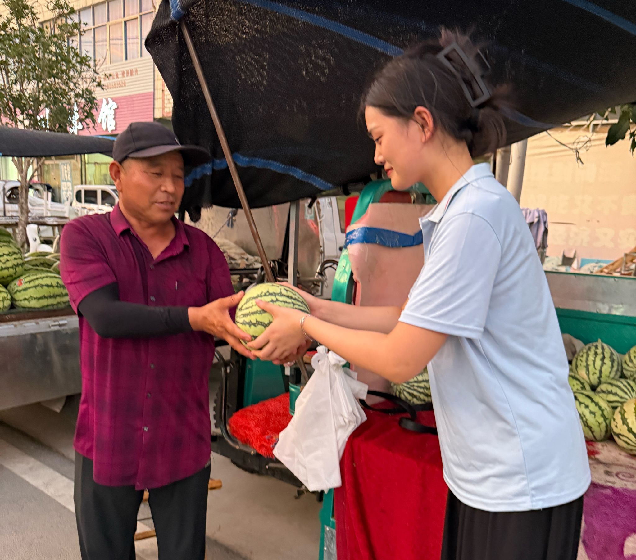 活动期间,队员们与种植户面对面交流,详细了解麒麟西瓜的种植规模、生长周期、病虫害防治、市场销路等情况,认真记录农户在种植和销售过程中遇到的困难与需求。得知采瓜人手不够,实践队成员化身“助农采摘员”,走进西瓜大棚,分工协作,小心翼翼地采摘成熟的麒麟西瓜完成装框。针对西瓜销售渠道较窄的问题,实践队积极拓展思路,多举措助力销售,利用社交媒体平台,拍摄西瓜种植环境、采摘过程等短视频,撰写推广文案,宣传郭庙镇麒麟西瓜的优良品质和特色优势,吸引更多消费者关注,同时,主动联系当地商超,搭建产销对接桥梁,帮助农户拓宽销售渠道,让清甜多汁的麒麟西瓜更快走向市场,切实增加农户收入。