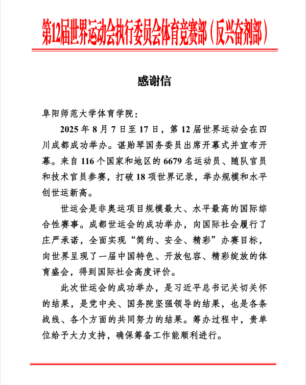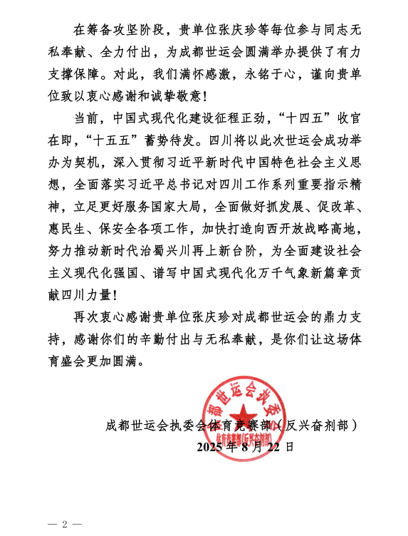 在本届世运会上执裁经历不仅提升了张庆珍老师在国际赛事中的知名度,也为他积累了宝贵的执裁经验和竞赛组织能力,为未来更好地服务于体育事业和体育学院竞技体育的发展奠定了坚实的基础。赛事结束后组委会给我校发来感谢信,进一步肯定了张庆珍老师在本次世运会工作中的优异表现。他的出色表现也为体育学院赢得了荣誉,展现了我校体育学院教师的专业素养和风采。张庆珍老师表示,体育学院教师有机会走向国际化舞台,这是机会也是更大的挑战,会把本次执裁所学转化为实际教学与训练实践,进一步优化民传专业培养方案,提升教师团队指导水平,为推动体育学院高质量发展、助力学校教学实践国际化贡献力量。