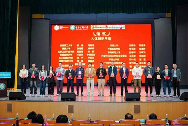 本次大赛由高等学校国家级实验教学示范中心联席会基础医学组与高等学校基础医学教师实践技能协同创新发展联盟共同主办、桂林医科大学承办,共吸引了全国73所院校的150支队伍参赛,设有人体解剖学、人体病理学、人体组织学及机能学四个组别。阜阳医学院孙宇轩、刘丽云等青年教师凭借扎实的专业功底和出色的教学创新表现,成功入围总决赛并取得优异成绩,充分展现了学院在实验教学创新与实践能力培养方面的积极探索与成效。其中,孙宇轩与刘晓飞老师荣获人体解剖学组铜奖,刘丽云与王德彪老师获得人体病理学组铜奖,郭智斐与马海涛老师则摘得机能学组铜奖。