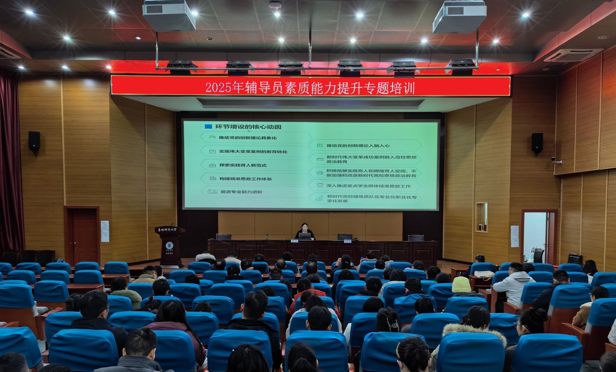 12月22日上午,学校特邀2024年全国高校辅导员素质能力提升骨干训练营“十佳标兵”、2024年广西“最美高校辅导员”、广西师范大学专职辅导员班宁来校为辅导员作专题辅导报告并开展工作交流,赋能辅导员队伍素质能力提升。党委学生工作部部长、学生工作处处长黄正杰参会并主持专题报告会和座谈交流会,学生工作处相关工作人员及全体专职辅导员120余人聆听了报告,30名参加学校2025年辅导员素质能力大赛校级决赛的选手与班宁进行了座谈交流。