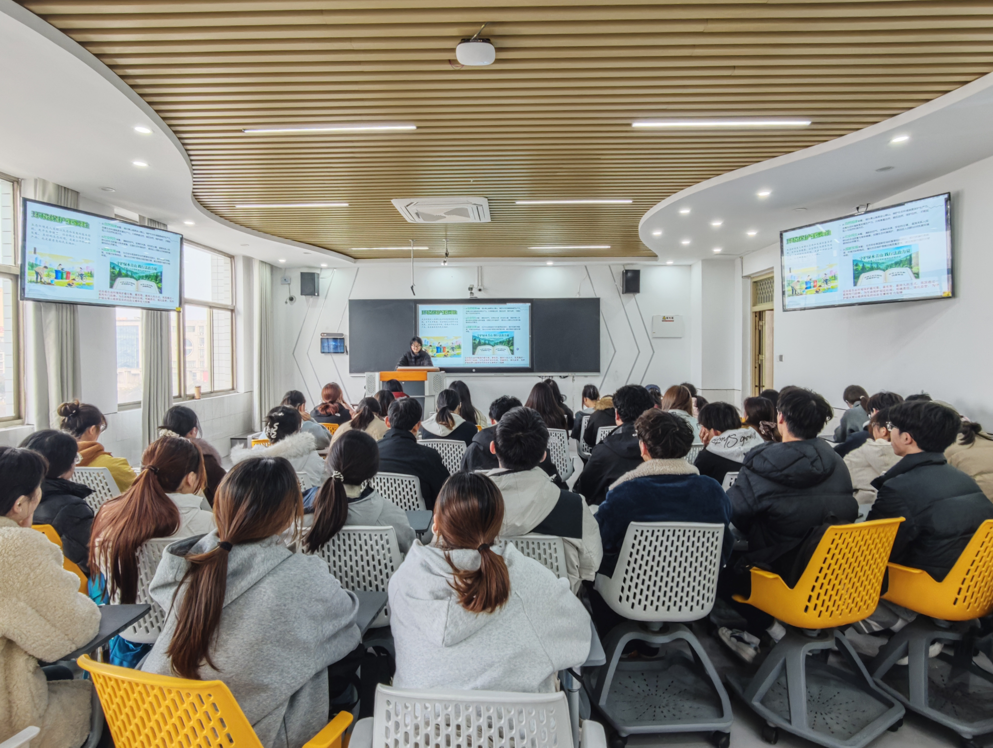 普法宣讲,让环保理念深入人心。3月11日,首场活动在西湖校区景行楼410教室举行。同学们化身“普法宣传员”,围绕《中华人民共和国环境保护法》《中华人民共和国森林法》《中华人民共和国大气污染防治法》等法律法规,通过法条讲解、案例解读、互动咨询等形式,普及生态环保相关的法律知识。志愿者们还结合近年来典型环境污染侵权案例,生动讲解破坏植被、非法砍伐、污染环境等行为的法律责任,详细解读了公民在生态保护中的法定权利与义务,引导大家树立“学法、懂法、守法、用法”的环保法治意识。大家纷纷表示,宣讲内容贴近生活、实用性强,令人受益匪浅。活动最后,全体人员共同学习了《中华人民共和国生态环境法典》。