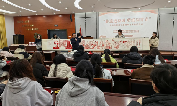 为深入推进中华优秀传统文化传承创新,丰富校园文化育人内涵,引导青年学子感悟传统文化魅力,3月18日下午,化学与材料工程学院邀请国家级非遗项目阜阳颍泉剪纸代表性传承人武俊强在理科综合楼二楼圆形报告厅开展沉浸式非遗体验活动。活动以“非遗+校园”为载体,搭建传统技艺与青年学子的对话桥梁,让非遗文化在学院落地生根、焕发生机。