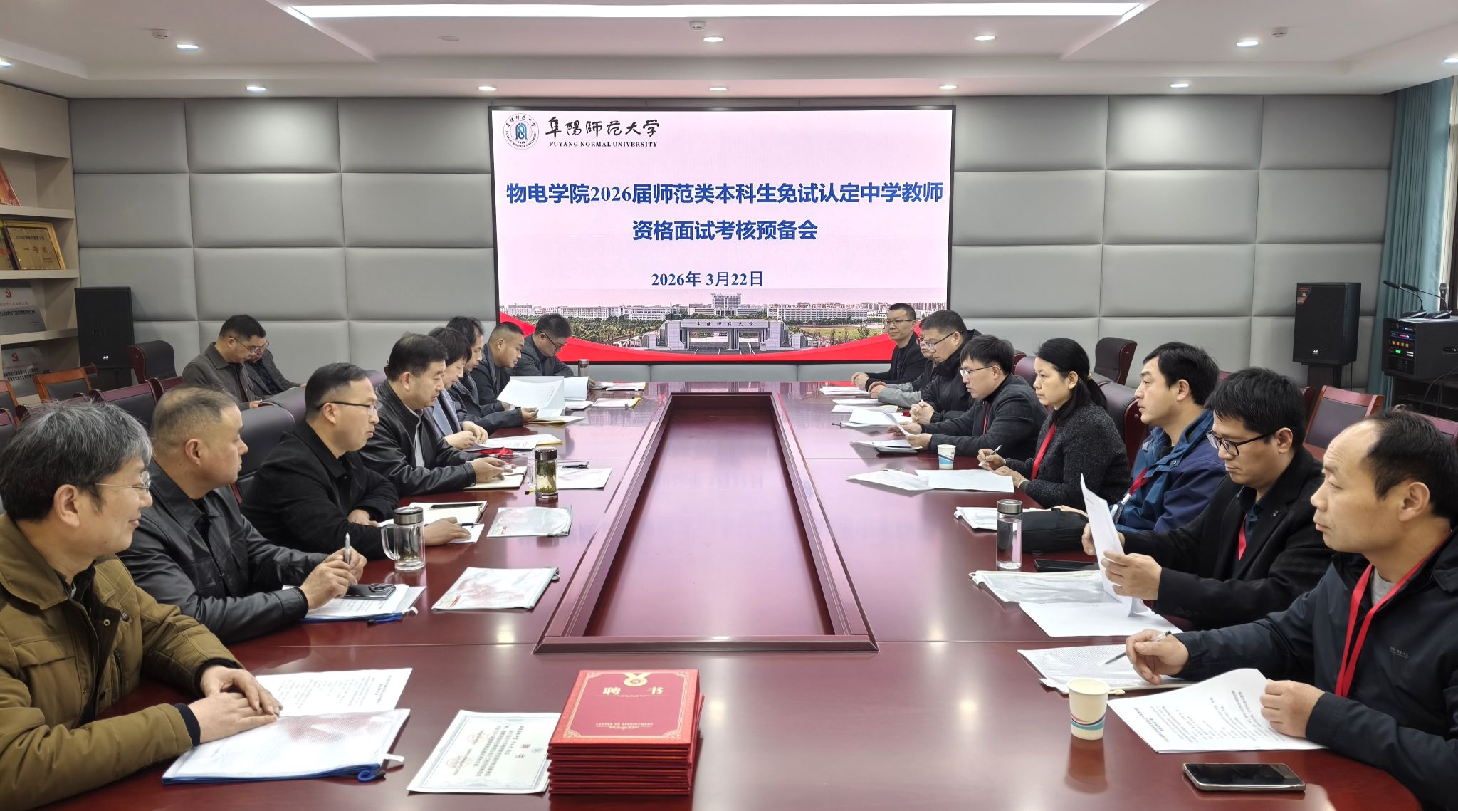 为强化师范生实践能力培养,提升人才培养质量,3月22日,物理与电子工程学院组织开展了2026届师范生免试认定教师资格面试考核活动。学院党委书记郦丹芸、院长朱勇、阜阳市基础教育专家和学院部分老师参加会议,2022级物理学和科学教育专业全体学生参加测试,会议由副院长张朋主持。