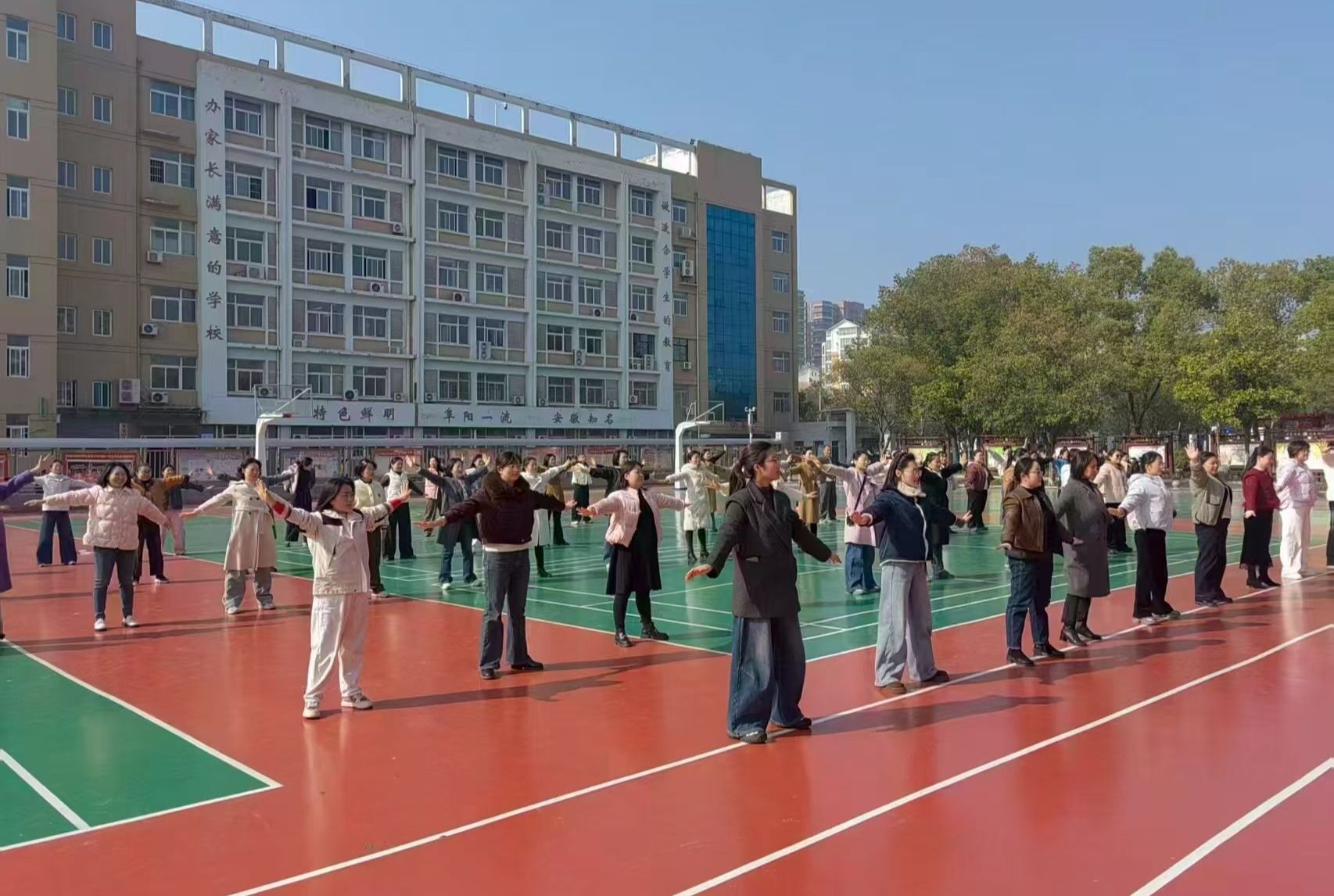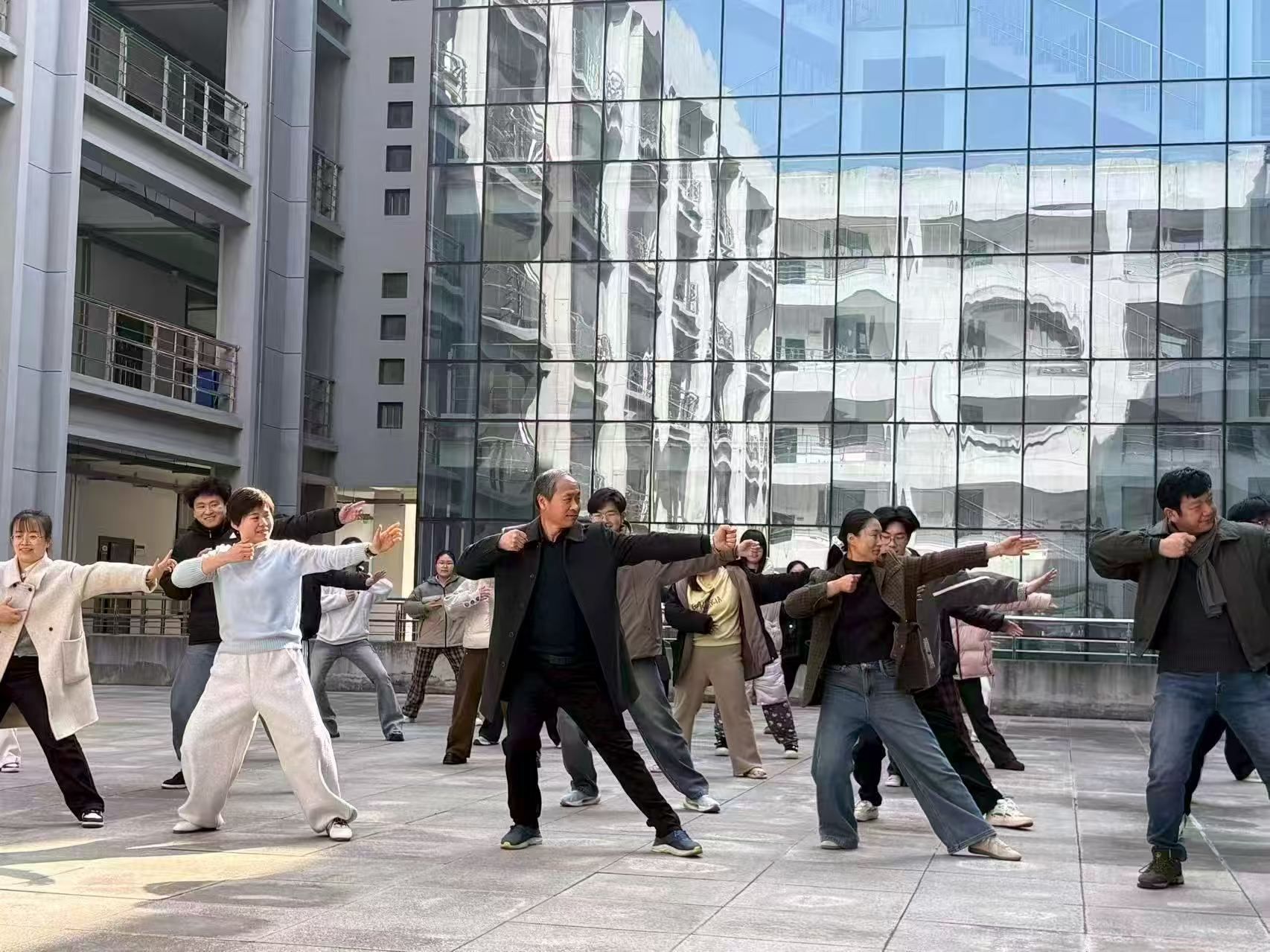 在此基础上,校工会联合机关党委向机关全体教师发起工间操活动倡议,于工作日上午大课间在正行楼前集中开展八段锦练习,由专业教练现场带练指导。活动自启动以来已连续举办多日,教职工参与热情持续高涨,在传统养生功法的习练中强健体魄、放松身心,形成了浓厚的健康锻炼氛围。