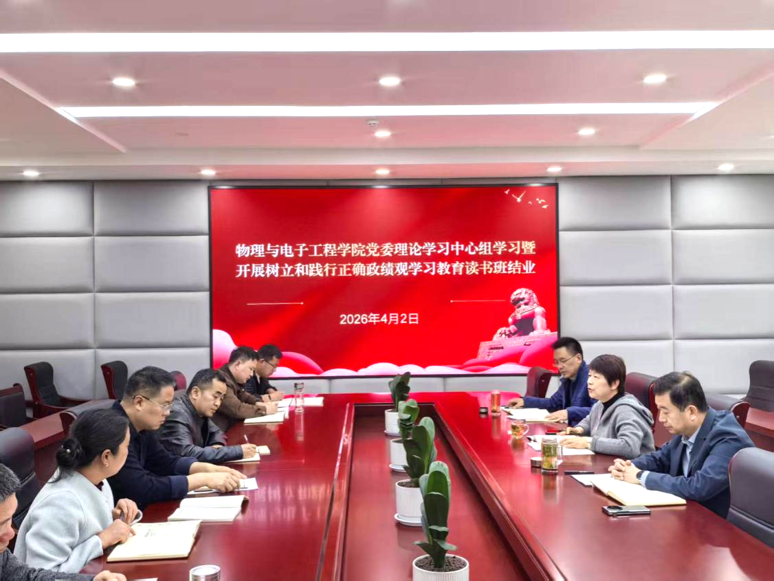 4月2日,物理与电子工程学院党委举行树立和践行正确政绩观学习教育读书班结业式暨党委理论学习中心组学习会。学院理论学习中心组全体成员参加会议。会议由党委书记郦丹芸主持。