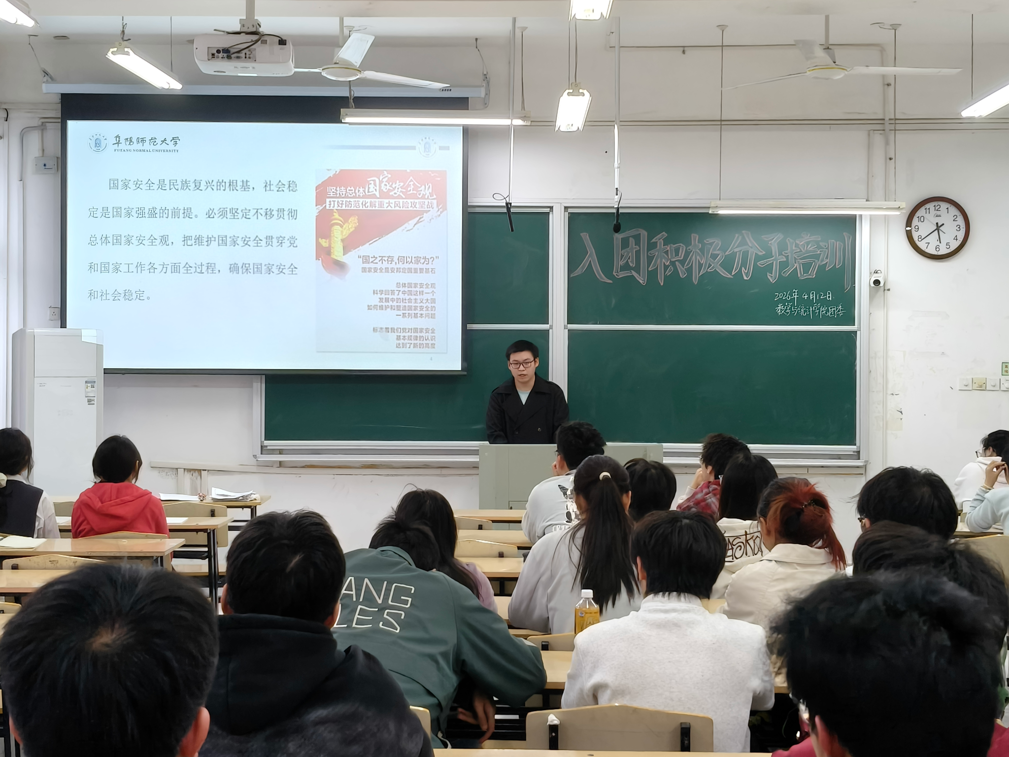 主题团课:国安知识入脑入心。4月12日晚,数学与统计学院邀请校“八一社”宣讲团成员荀耀东为学院全体入团积极分子讲授了一堂别开生面的国家安全教育主题团课。荀耀东结合自身在“八一社”的学习实践经历,围绕“国家安全 青春挺膺”主题,从政治安全、国土安全、军事安全、网络安全、生物安全等多个维度,深入浅出地讲解了国家安全的基本内涵和当前面临的复杂形势。他用鲜活的案例、翔实的数据和生动的语言,向同学们阐释了“国家安全无小事”的深刻道理。在场入团积极分子认真聆听、积极互动、分组研讨,进一步加深了对国家安全的认识,并表示将在今后的学习和生活中时刻绷紧国家安全这根弦,以实际行动维护国家安全。