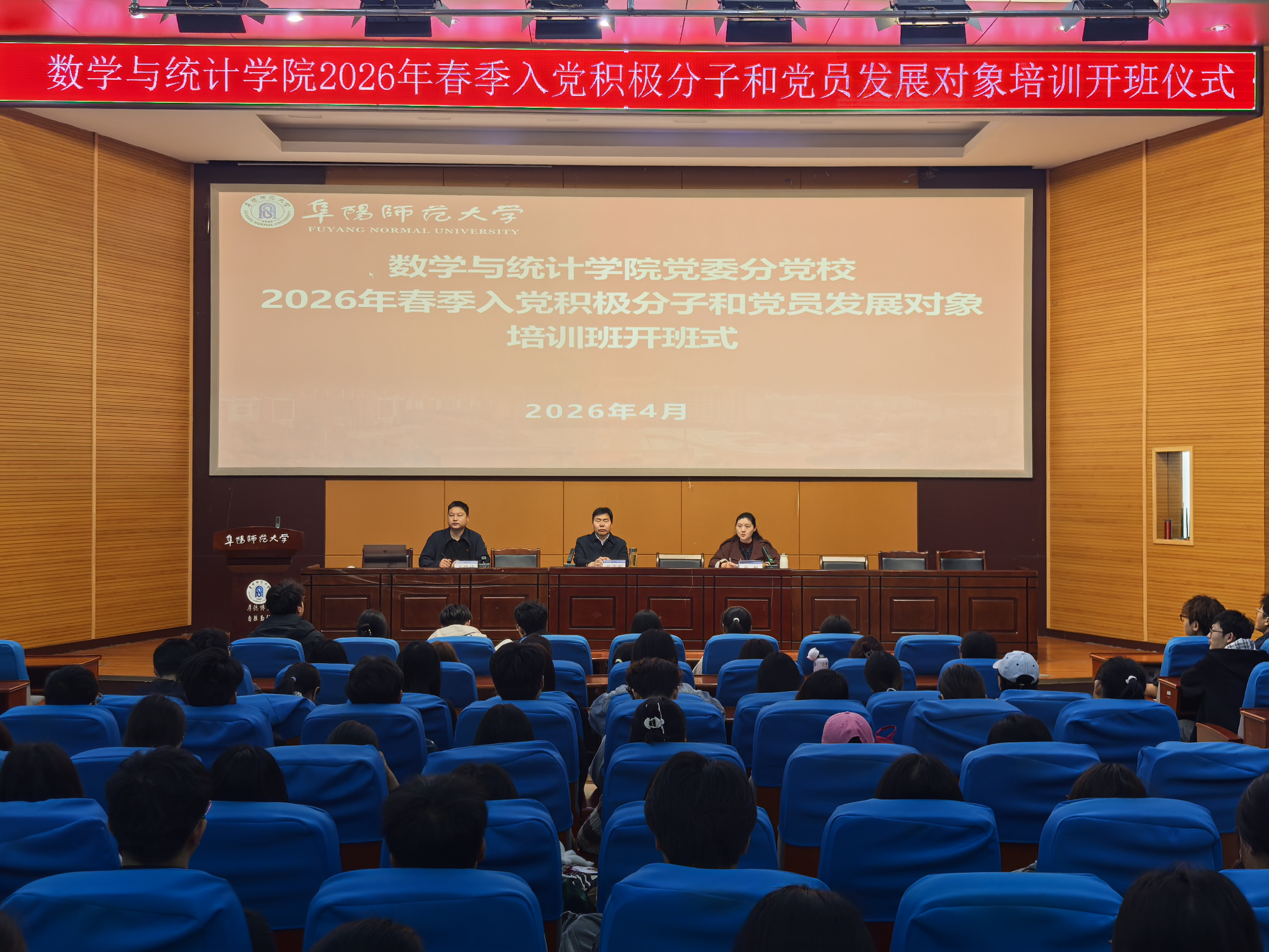 为扎实做好入党积极分子和发展对象培训工作,切实提升发展党员质量,4月18日上午,数学与统计学院在躬行F楼报告厅举办2026年春季入党积极分子和25期发展对象培训班开班仪式。学院党委书记吴学军出席开班式并作动员讲话,培训班班主任王治成及全体学员参加开班式,开班式由学院党委副书记、纪委书记徐悦主持。