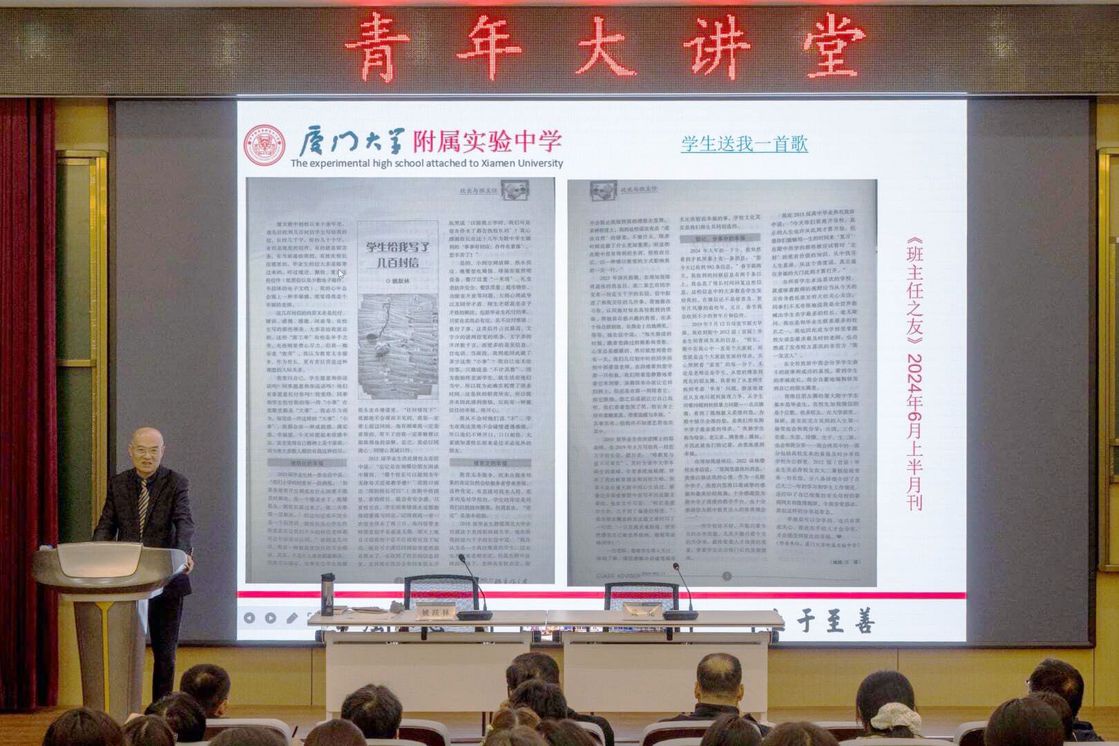 在谈及教育实践时,姚跃林分享了担任厦门大学附属实验中学校长期间的育人故事。他始终坚守“以生为本”,将母校的育人初心融入办学全过程,推动学校文化建设、课程改革与教师专业发展,打造开放自由的成长环境,推行自由写作等特色育人举措,努力让每一名学生都能在校园中找到归属感、成就感与成长动力,用实际行动践行“让教育带着温度落地”的育人追求。
