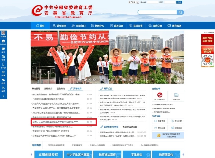 10月8日,安徽教育网首页报道:梦想,从这里启航 阜阳师范大学喜迎首届国际学生。文章地址: