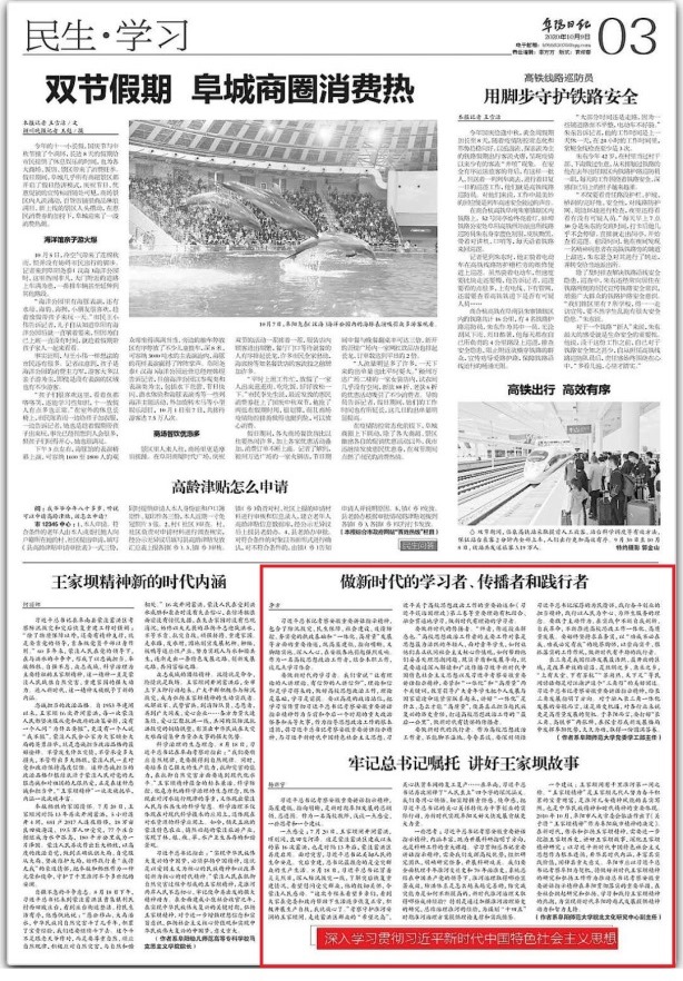 10月9日,《阜阳日报》A3版报道:我校教师学习宣传贯彻习近平总书记考察安徽重要讲话精神学习心得体会。文章地址:https://test.fynews.net/mepaper/mobile/paper/index?pubCode=fyrb&pubDate=2020-10-09#_A3