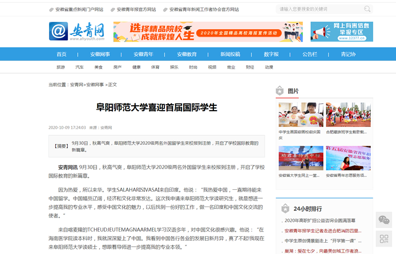 10月9日,安青网报道:阜阳师范大学喜迎首届国际学生。文章地址: