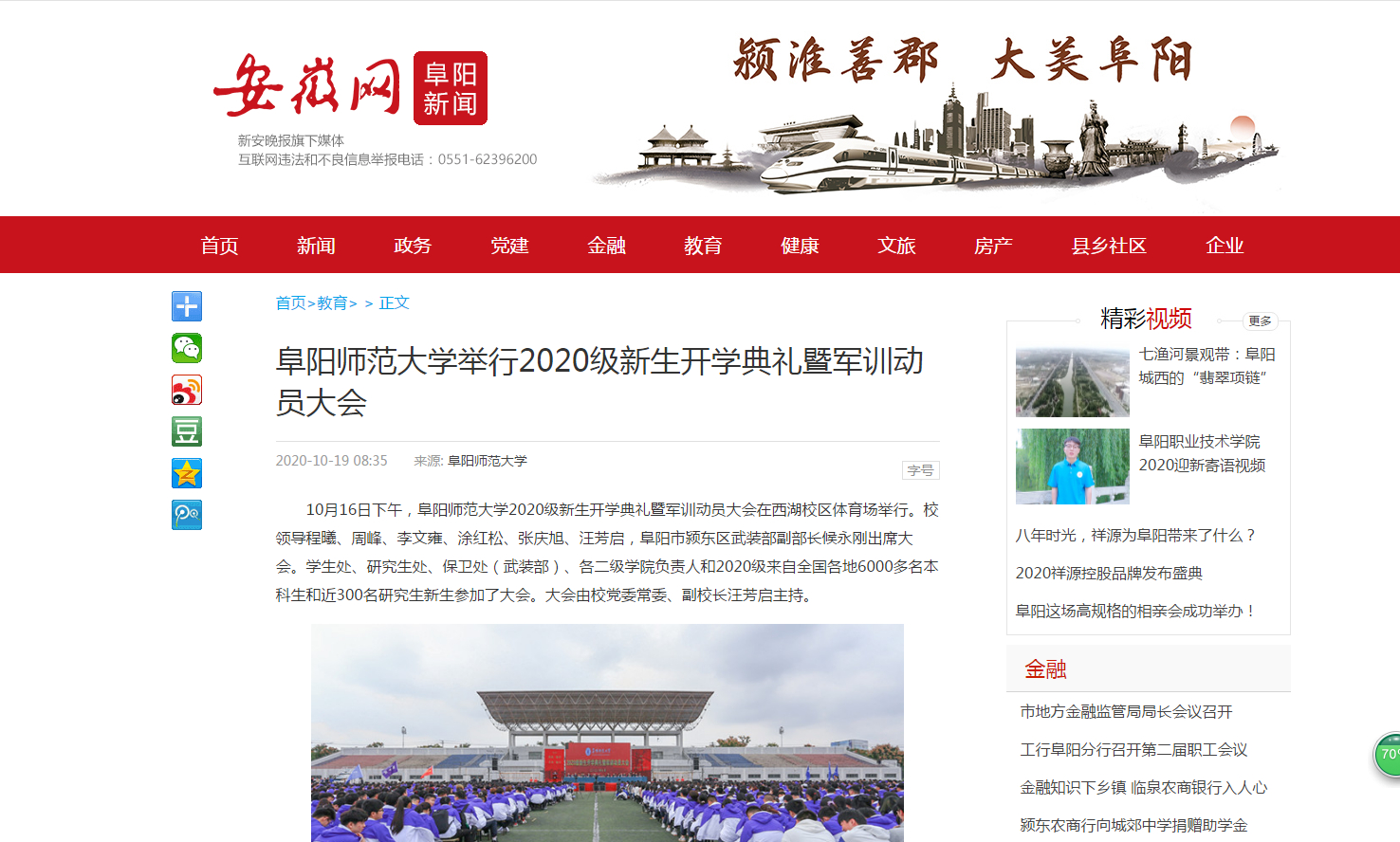 10月19日,安徽网报道:阜阳师范大学举行2020级新生开学典礼暨军训动员大会。文章地址: