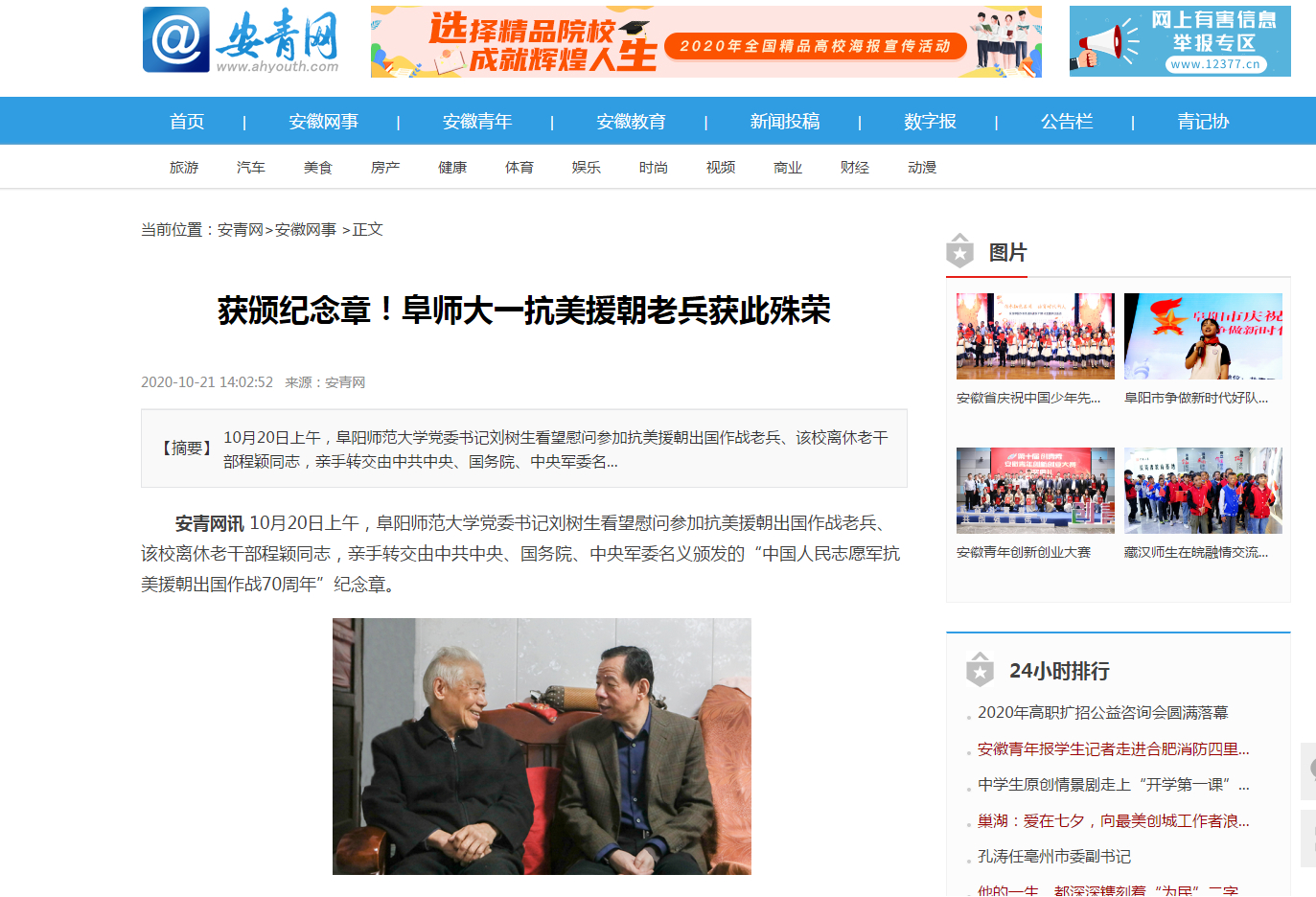 10月21日,安青网报道:获颁纪念章!阜师大一抗美援朝老兵获此殊荣。文章地址: