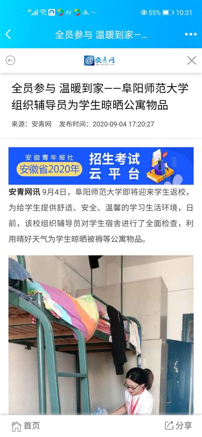 9月4日,安青网报道:全员参与 温暖到家——阜阳师范大学组织辅导员为学生晾晒公寓物品。文章地址: