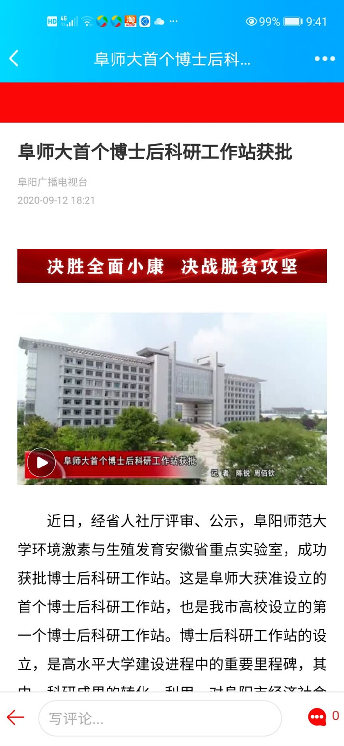 9月12日,阜阳新闻联播报道:阜师大首个博士后科研工作站获批。文章地址:https://mtydazzle.yunshicloud.com/pages/details/details.html?companyId=0109D2C4607E4F80&productId=AB90ED651FBE420783D299FA6E10CCDC&docid=E76E4A38C47D41CB94867E48FA71A444&isNew=yes&downloadTips=true