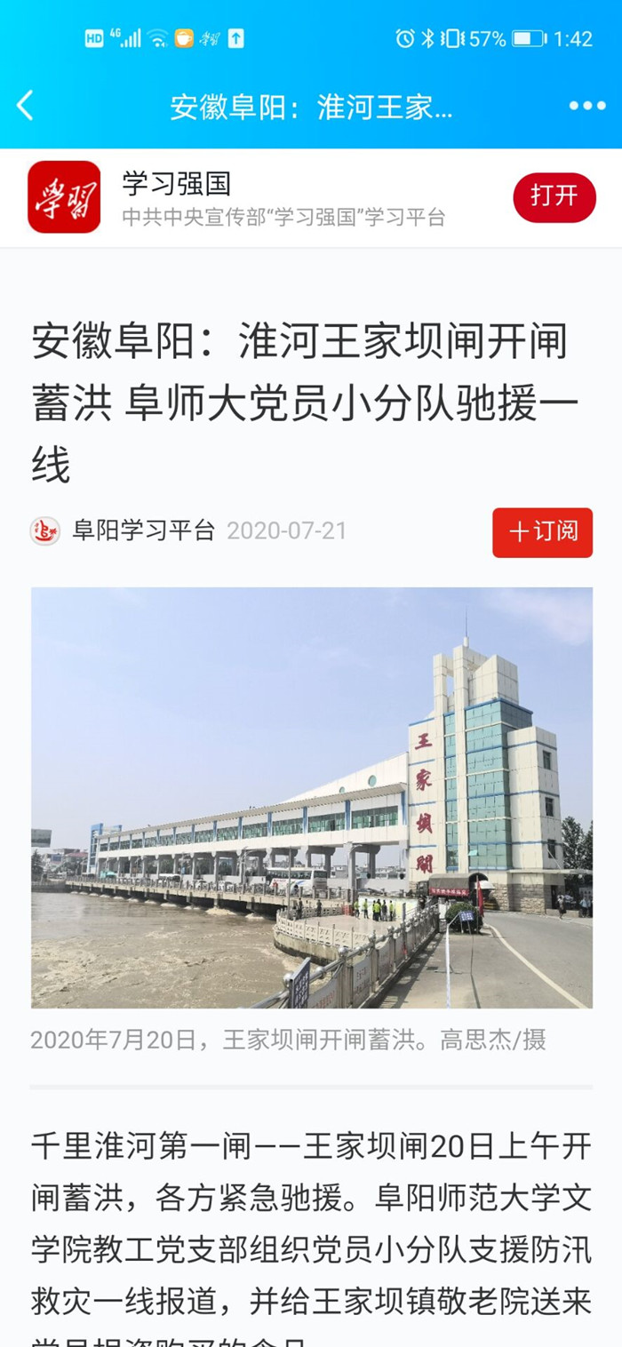 7月21日,“学习强国”学习平台报道:安徽阜阳:淮河王家坝闸开闸蓄洪 阜师大党员小分队驰援一线。文章地址:https://article.xuexi.cn/articles/index.html?art_id=7116179049121317677&item_id=7116179049121317677&study_style_id=feeds_default&pid=&ptype=-1&source=