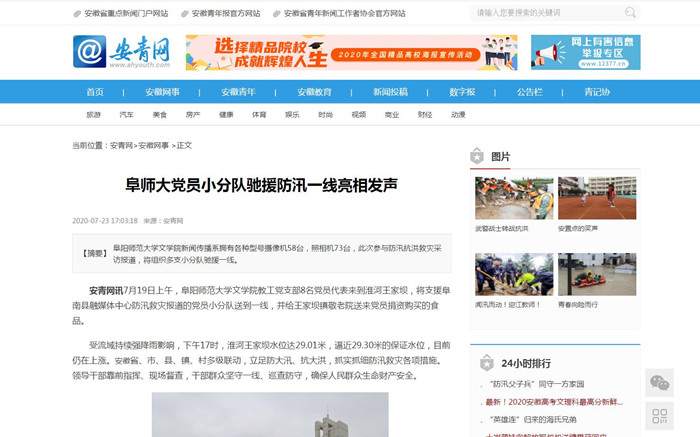 7月23日,安青网报道:阜师大党员小分队驰援防汛一线亮相发声。文章地址: