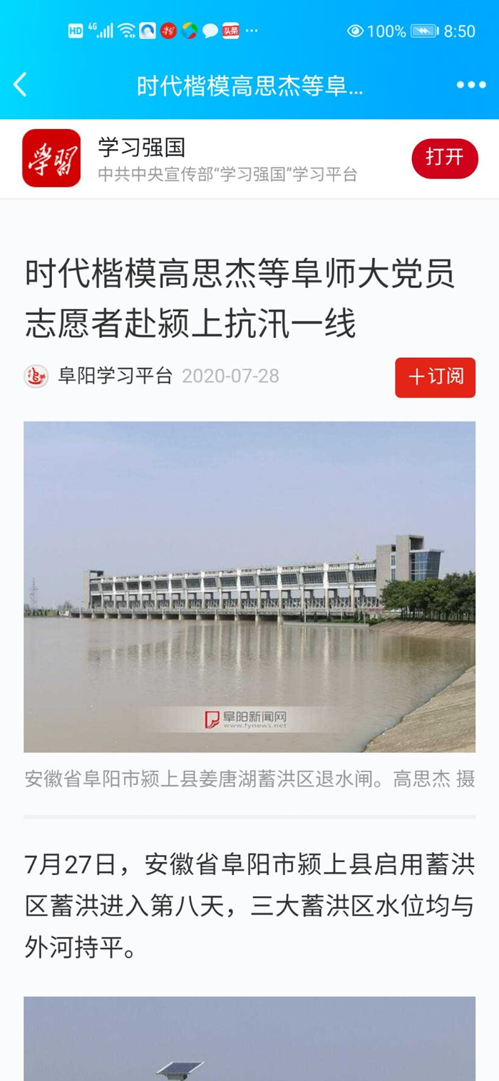 7月28日,“学习强国”学习平台报道:时代楷模高思杰等阜师大党员志愿者赴颍上抗汛一线。文章地址:https://article.xuexi.cn/articles/index.html?art_id=9046596672966208295&item_id=9046596672966208295&study_style_id=feeds_default&t=1596793118388&showmenu=false&pid=&ptype=-1&share_to=wx_single&from=singlemessage&source=share