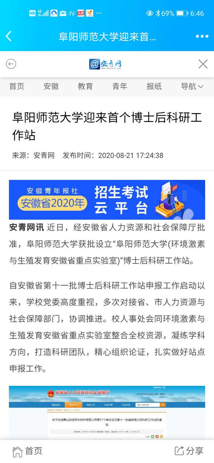8月21日,安青网报道:阜阳师范大学迎来首个博士后科研工作站。文章地址: