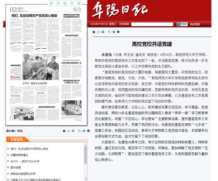 7月1日,阜阳日报报道:高校党校共话党建。文章地址:http://test.fynews.net/epaper/read.do?m=i&iid=1190&eid=12197&sid=43111&idate=1_2020-07-01