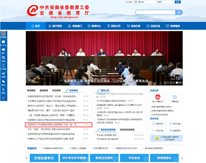 5月25日,安徽教育网首页报道:阜阳师范大学志愿者开展线上教育帮扶 为战“疫”注入青春力量。文章地址: