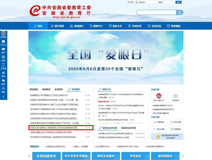6月7日,安徽教育网首页报道:科研引领 制度先行 阜阳师范大学深化科研制度改革助力高水平大学建设。文章地址: