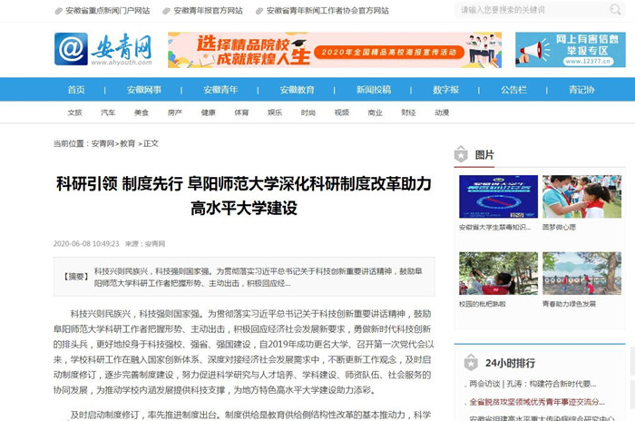 6月8日,安青网报道:科研引领 制度先行 阜阳师范大学深化科研制度改革助力高水平大学建设。文章地址:http://www.ahyouth.com/news/20200608/1459422.shtml
