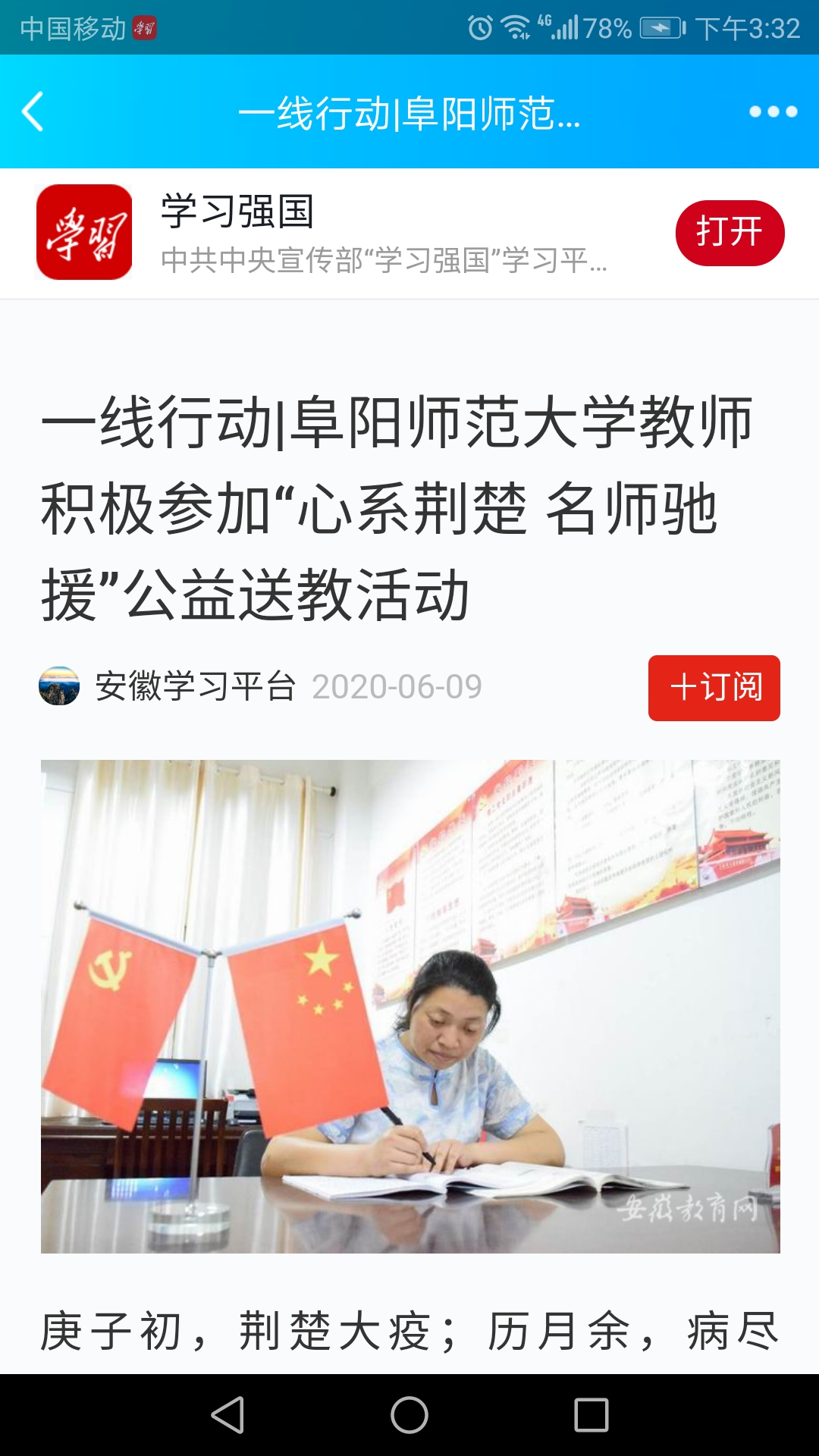 6月9日,“学习强国”学习平台报道:一线行动|阜阳师范大学教师积极参加“心系荆楚 名师驰援”公益送教活动。文章地址:https://article.xuexi.cn/articles/index.html?art_id=1929213715341438647&item_id=1929213715341438647&study_style_id=feeds_default&pid=&ptype=-1&source=&tdsourcetag=s_pctim_aiomsg